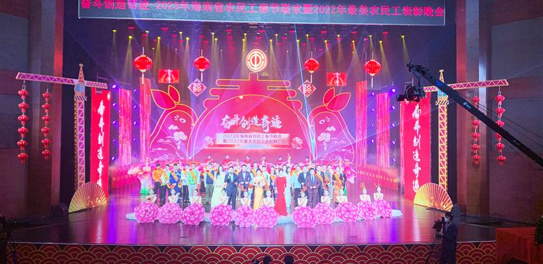 | 1月9日晚,由海南省总工会主办、海南广播电视总台(集团)承办、海南新闻频道执行的“奋斗创造奇迹”2023年海南省农民工春节联欢暨2022年最美农民工表彰晚会在海南省歌舞剧院举行,晚会现场宣布2023年“暖心留工助发展”工会关爱送温暖行动正式启动。省人大常委会副主任、省总工会主席陆志远,省总工会党组书记、常务副主席王全,省总工会党组副书记、副主席赖泳文出席活动并为“最美农民工”颁奖。晚会在开场歌舞《欢乐中国年》的热烈氛围中拉开了帷幕,结合歌舞《最美的你》、... |