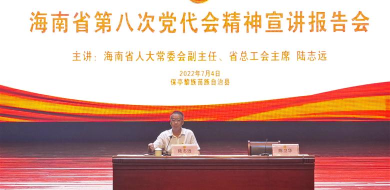 | 为进一步推动全省各级工会干部和职工群众兴起学习宣传贯彻习近平总书记考察海南重要讲话精神和省第八次党代会精神热潮,按照省委的统一部署,结合开展“能力提升建设年”暨深化拓展“查堵点、破难题、促发展”活动,7月4日,省人大常委会副主任、省总工会主席陆志远到保亭县为全县各级工会干部和职工代表宣讲省第八次党代会精神,并开展工会工作调研,省总工会党组书记、常务副主席王全,保亭县委书记穆克瑞,县长王惠仙,县人大常委会主任王秀美,保亭县委常委、统战部长陈卫华... |