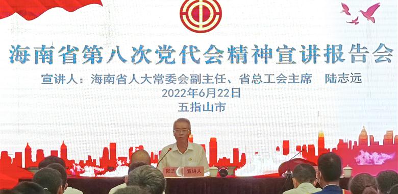| 为进一步推动全省各级工会干部和职工群众兴起学习宣传贯彻落实习近平总书记考察海南重要讲话精神和省第八次党代会精神热潮,按照省委的统一部署,结合开展“能力提升建设年”和深化拓展“查堵点、破难题、促发展”活动,6月22日,省人大常委会副主任、省总工会主席陆志远在五指山市为工会干部和职工代表宣讲省第八次党代会精神。陆志远指出,省第八次党代会的胜利召开,是全省人民政治生活中的一件大事。对团结带领全省广大党员干部群众,高举中国特色社会主义伟大旗帜,牢记习近... |