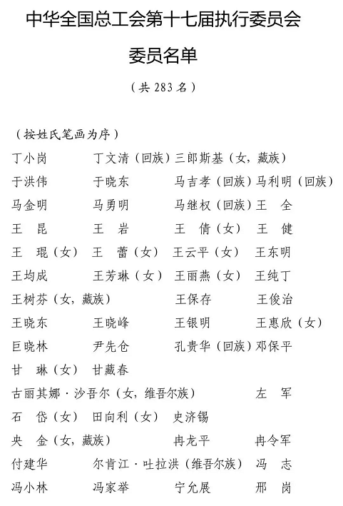 中华全国总工会第十七届执行委员会由丁小岗等283名委员组成,中华全国总工会第十七届经费审查委员会由丁巍等38名委员组成。当大会宣布选举结果时,全体与会代表热烈鼓掌,祝贺中国工会新一届领导机构诞生。