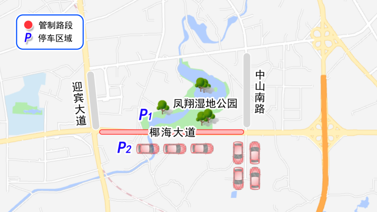 凤翔湿地公园停车场;椰海大道(迎宾大道路口至中山南路口)南侧临时停车点;周边商业停车场。