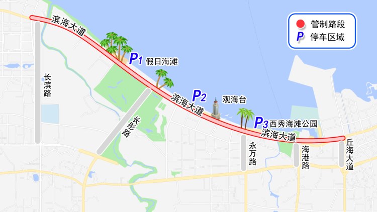 假日海滩、观海台、西秀海滩公园停车场;