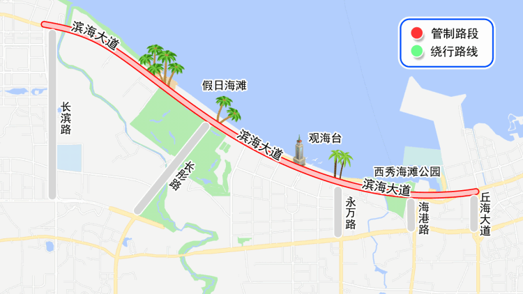 交通管制后建议途经车辆绕行龙昆南路、滨江路。美兰机场往返车辆绕行琼州大桥、机场联络线。