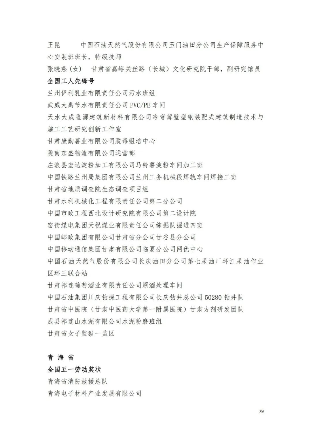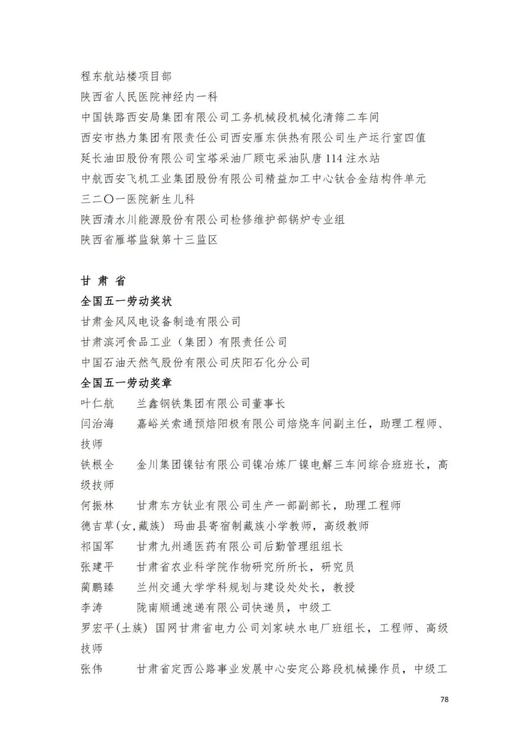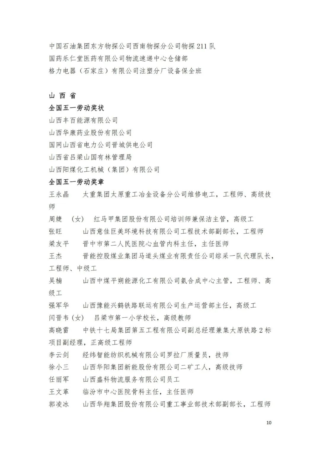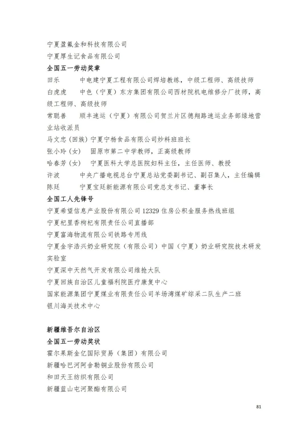 为表彰先进、树立典型,大力弘扬劳模精神、劳动精神、工匠精神,激励广大职工积极投身中国式现代化建设,中华全国总工会决定,授予北京天科合达半导体股份有限公司等255个单位全国五一劳动奖状,授予郝利斌等1088名职工全国五一劳动奖章,授予北汽福田汽车股份有限公司工程研究总院轻卡技术中心等1034个集体全国工人先锋号。希望受到表彰的集体和个人珍惜荣誉、再接再厉,发挥模范带头作用,在新征程上不断展现新作为、创造新业绩。