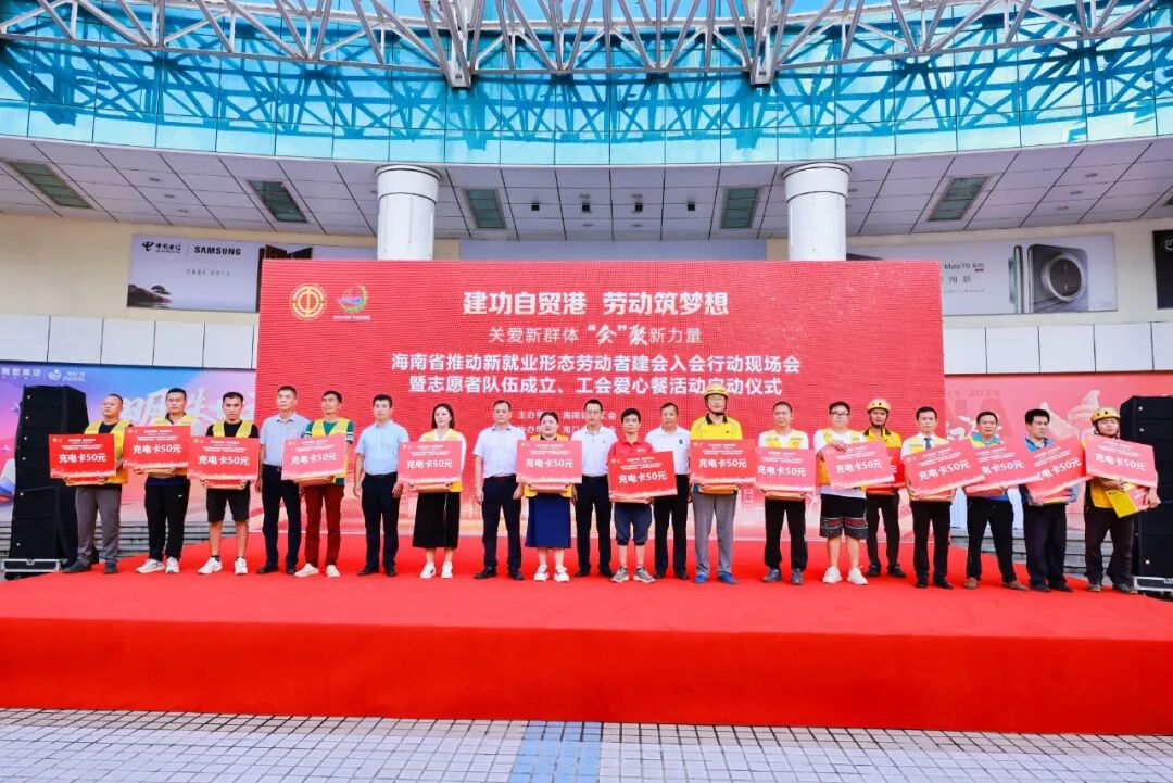 10月15日上午,海南省推动新就业形态劳动者建会入会行动现场会暨志愿者队伍成立、工会爱心餐活动启动仪式在海口明珠广场圆满落幕。省总工会相关领导,有关市县工会领导,平台企业代表,以及来自快递配送、网约车、货车运输等领域的新就业形态劳动者代表400余人齐聚现场,共同见证这场聚焦“新”群体、传递“暖”服务的盛会。