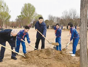 2019年4月8日,党和国家领导人习近平、栗战书、汪洋、王沪宁、赵乐际、韩正、王岐山等来到北京市通州区永顺镇参加首都义务植树活动。这是习近平同大家一起植树。