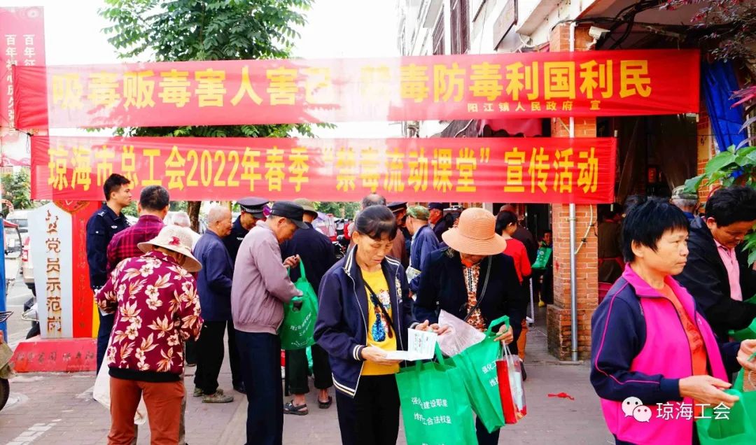 3月11日上午,琼海市总工会联合阳江镇政府在阳江镇人流密集路段开展2022年春季“禁毒流动课堂”宣传活动。