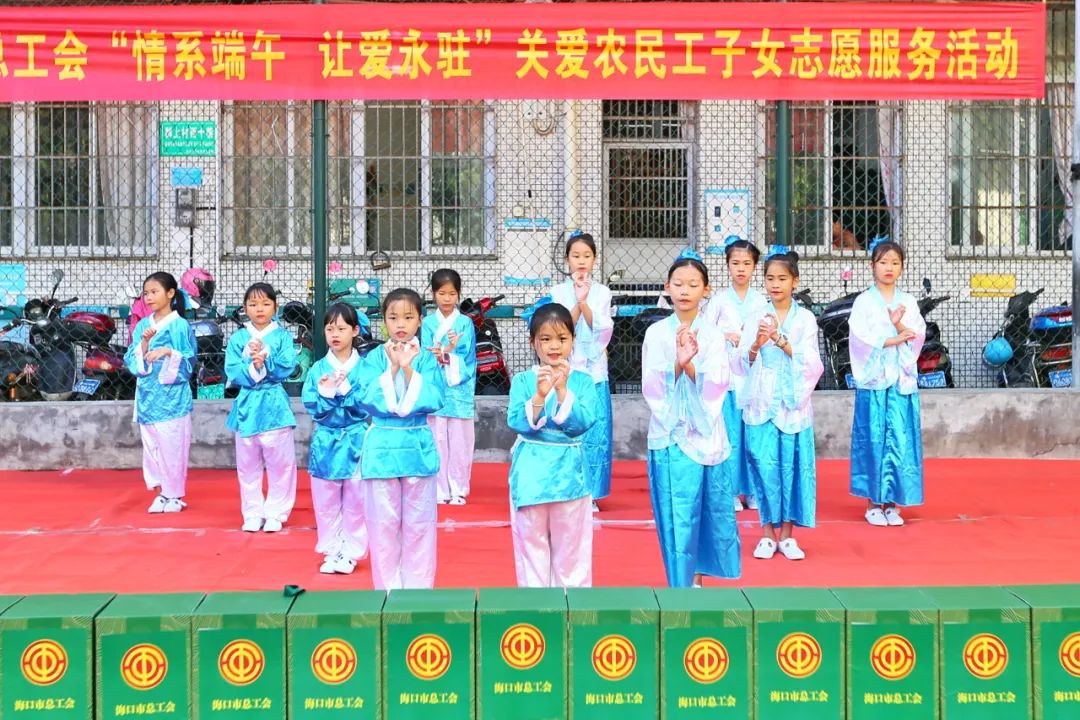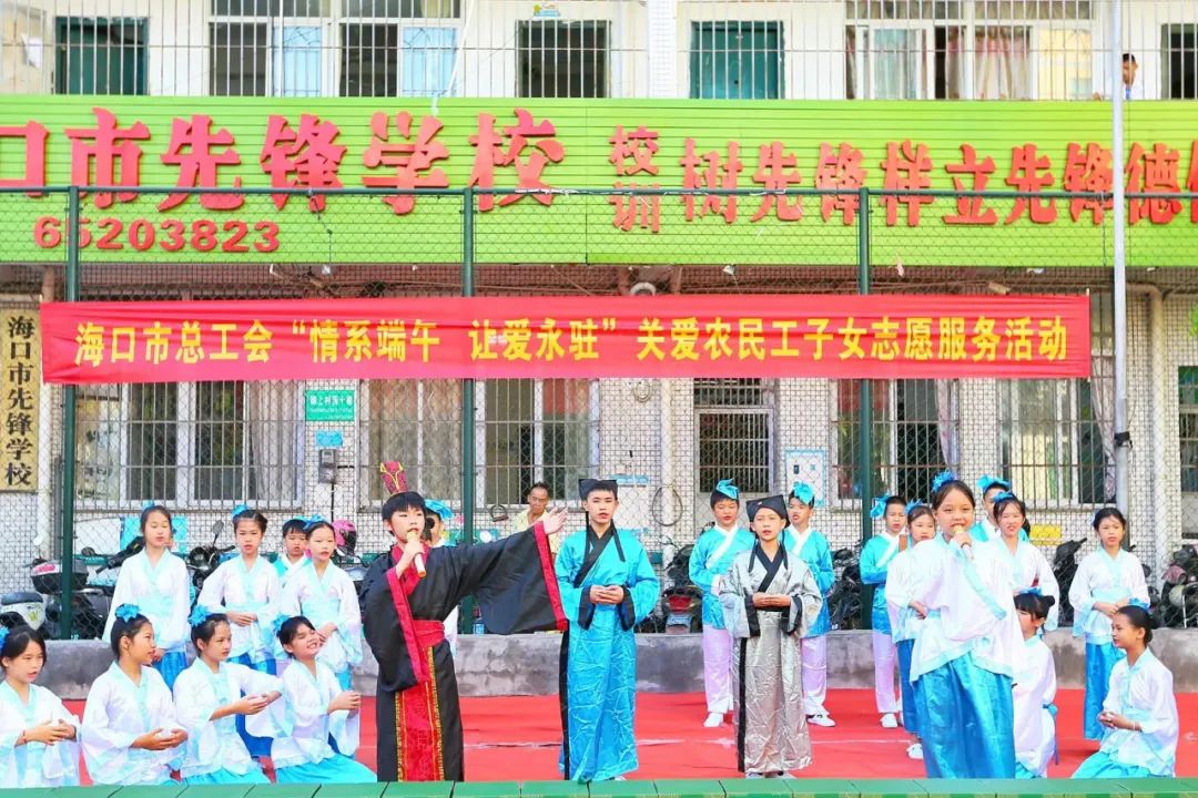 为加强对农民工家庭的人文关怀,营造社会关爱农民工及支持参与未成年人保护工作的良好氛围,6月2日上午,海口市总工会党员志愿者走进海口先锋学校开展“情系端午 让爱永驻”关爱农民工子女志愿服务活动。海口市总工会党组成员、副主席林小玉、林文勇,机关党委党员志愿者,先锋学校校长黎芳及师生200余人参加活动。海口市总工会权益保障部(女职工部)部长覃湘主持。