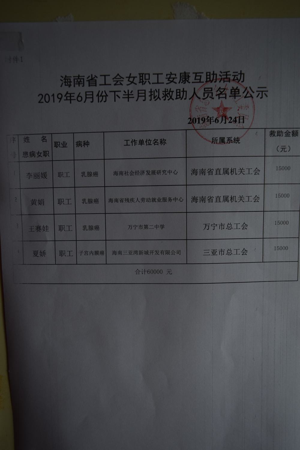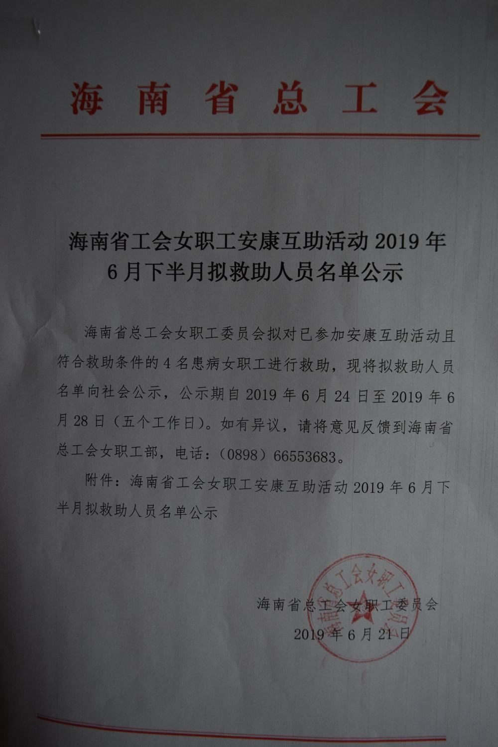 海南省总工会女职工安康互助活动2019年6月份下半月拟救助人员名单公示