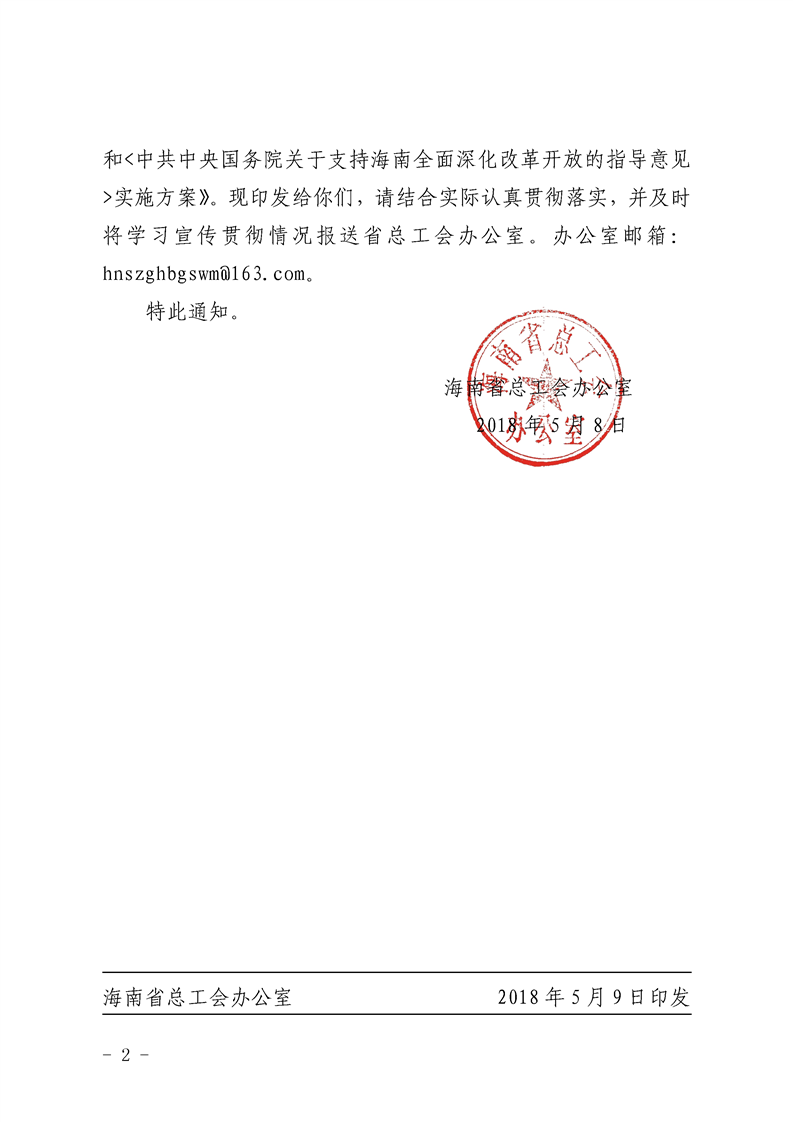 关于印发《海南省工会系统学习宣传贯彻习近平总书记在庆祝海南建省办经济特区30周年大会上的重要讲话和<中共中央国务院关于支持海南全面深化改革开放的指导意见>实施方案》的通知(琼工办发〔2018〕85号)