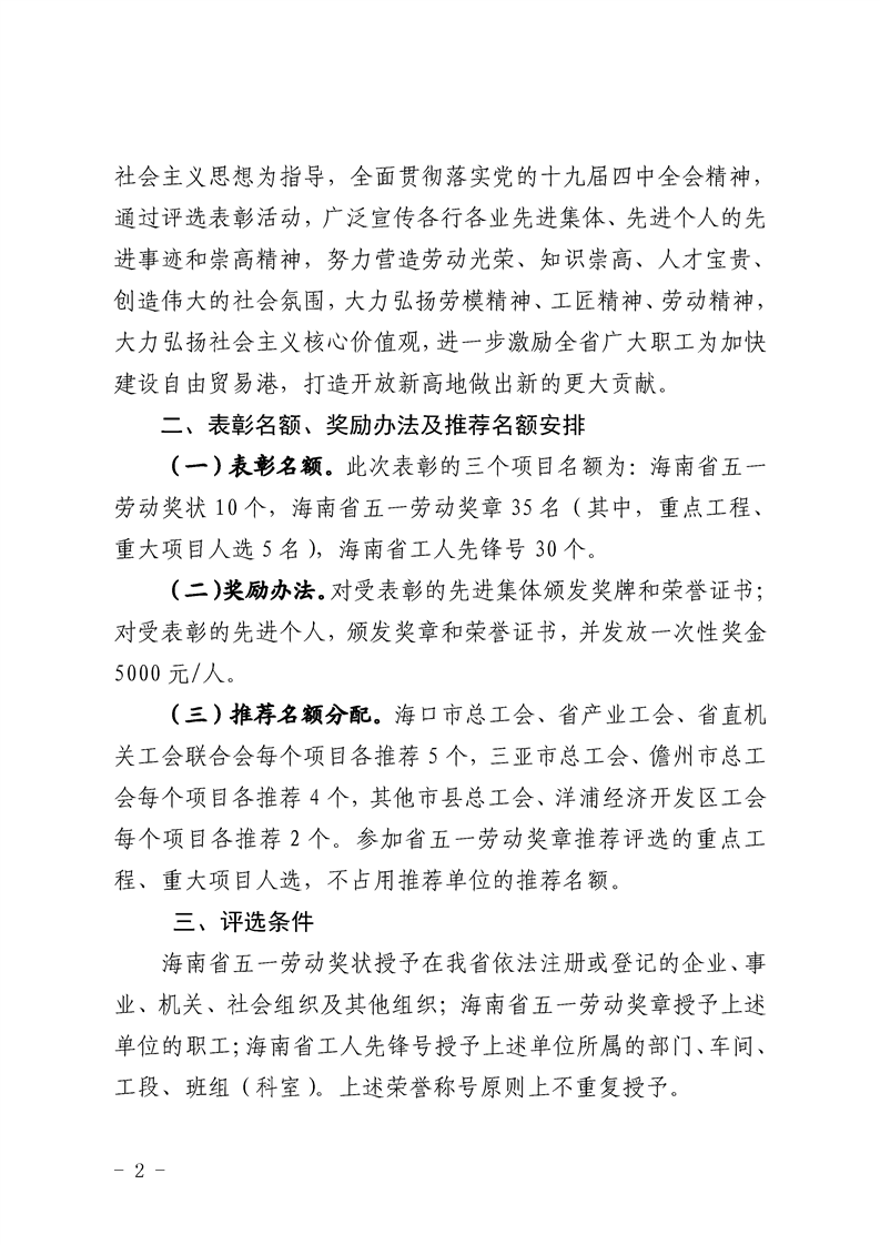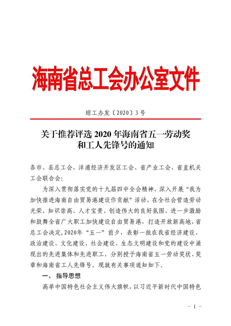 关于推荐评选2020年海南省五一劳动奖工作的通知(琼工办发〔2020〕3 号)