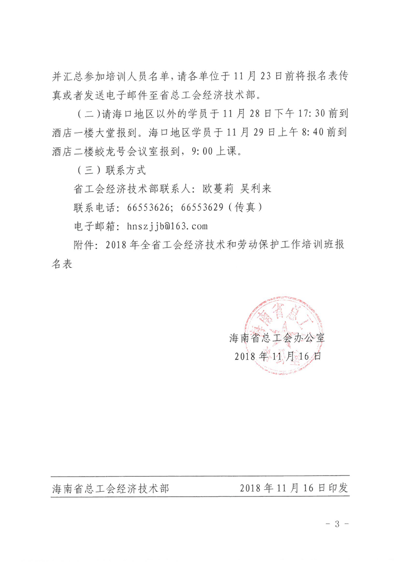 关于举办2018年全省工会经济技术和劳动保护工作培训班的通知(琼工办发〔2018〕169号)