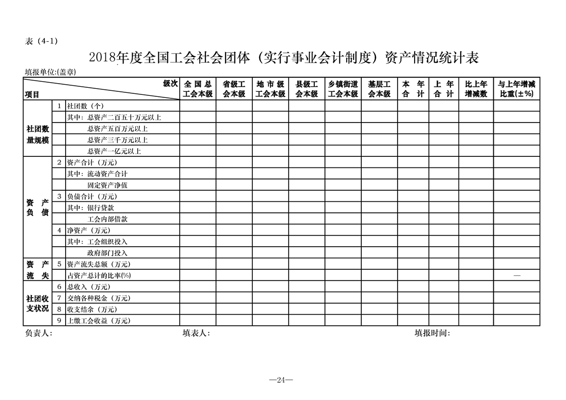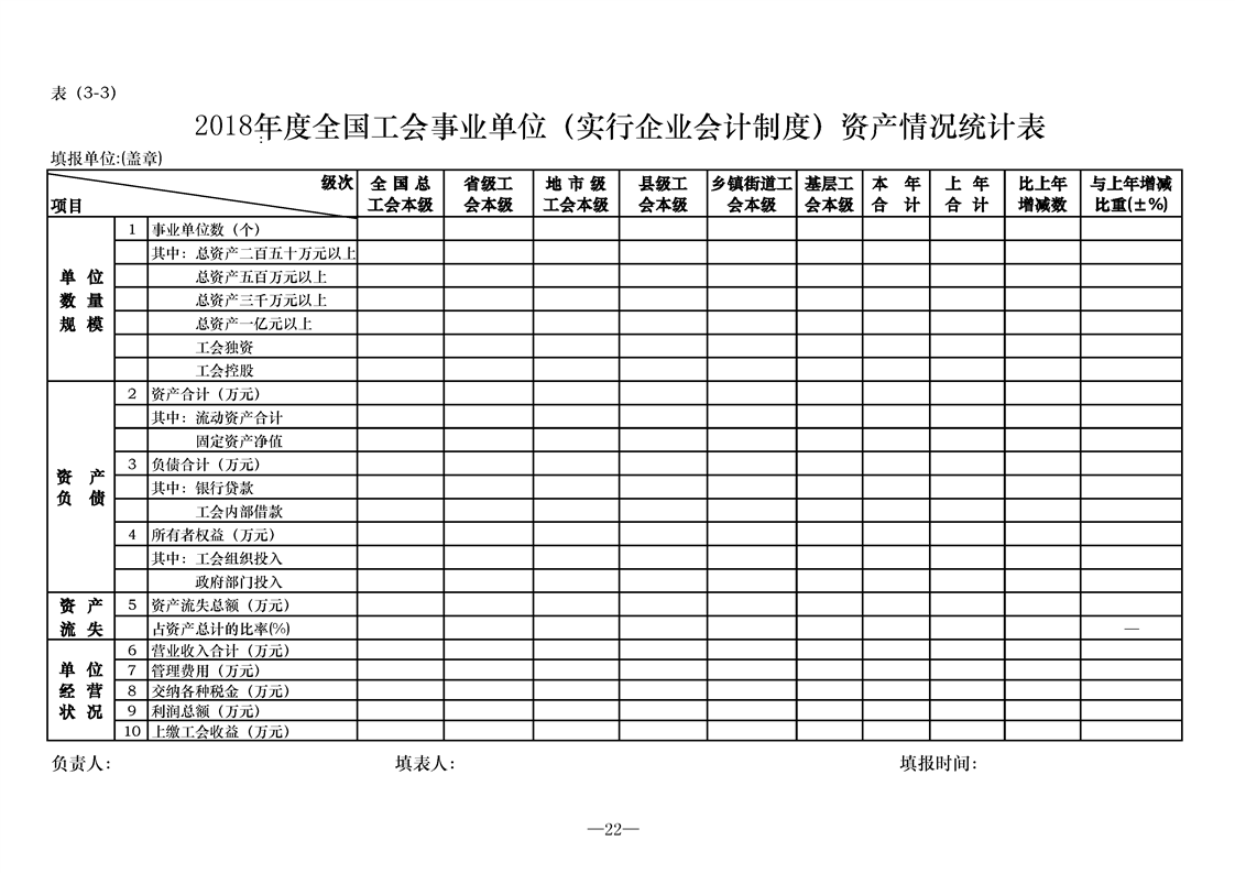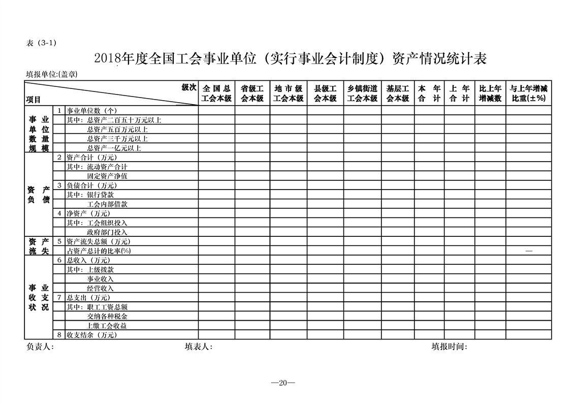 十八、“工会资产流失总额”按各级工会行政单位当年流失的全部工会行政性资产总额填报。