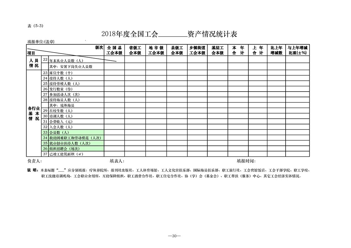 二、本表转发至各级工会所辖基层工会。由各基层工会、乡镇(街道)工会、县级工会、地(市)级工会、省级工会在各项目中分别填列后,上报主管工会汇总并由各主管工会逐级汇总(含本级和下级)上报(现“基层工会”一栏暂不填报)。