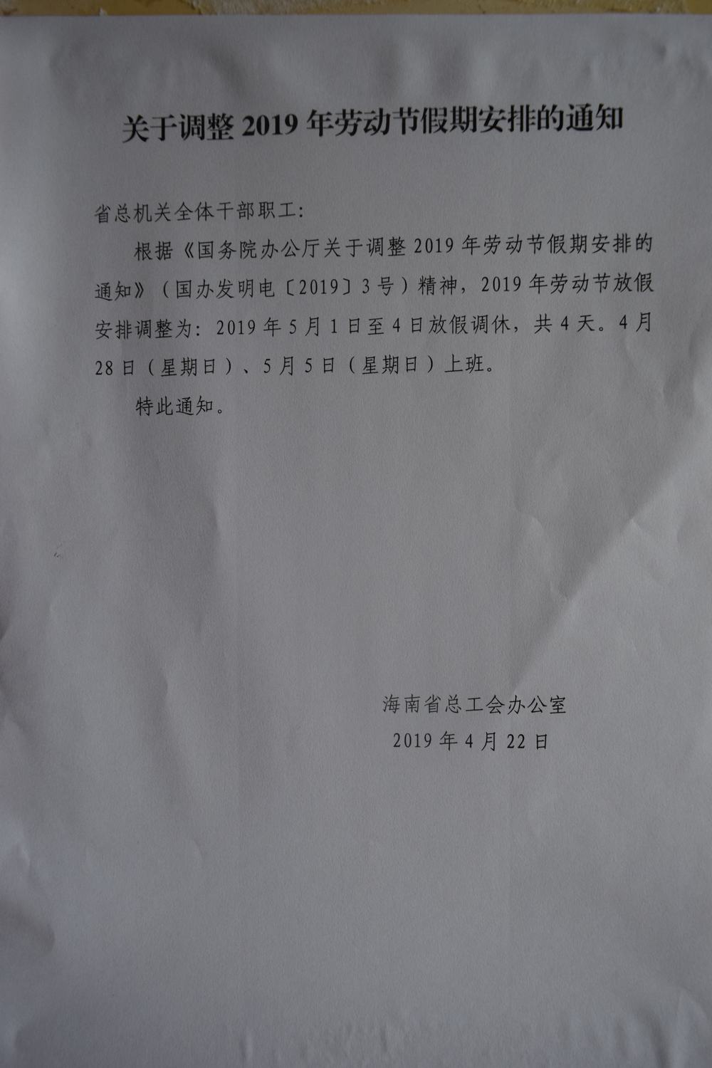 关于调整2019年劳动节假期安排的通知