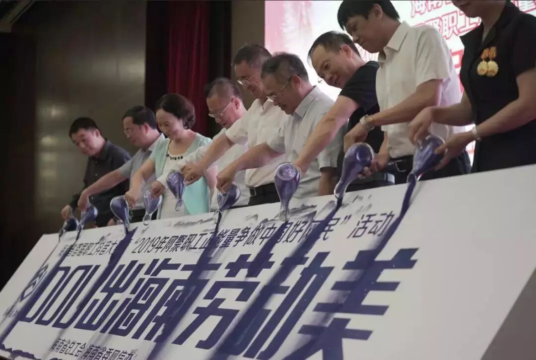 启动仪式现场,随着陆志远副主任宣布活动开启,九位领导嘉宾同时把手中的蓝色沙子倒入鎏沙台,“‘dou出海南劳动美’海南省首届职工抖音大赛暨‘2019年网聚职工正能量争做中国好网民’”字样逐渐显现,至此,本次抖音大赛正式启动。