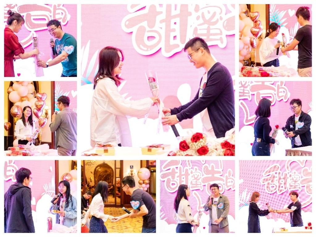 本次活动主办方以香槟色为主色调精心打造了温馨浪漫的现场布景,男女嘉宾入场首先在签到墙上留下自己的签名和祝福,开场致辞后,正式展开丰富多彩的联谊活动。 在主持人的带领下,男女嘉宾完成合力建塔、骑士公主大冒险等游戏环节,通过几轮游戏下来男女嘉宾初步建立了默契,拉近了彼此的距离。本次活动还设置了才艺展示的环节,让大家有机会尽情洋溢才华,舞台上轮番上演情景剧,歌曲,舞蹈等精彩节目,台下掌声喝彩声不断,才艺展示环节也进一步加深了彼此的印象。经过消除距离的游戏后,真情面对面环节,男女嘉宾自行选择有好感的对象进行深入交流,增加彼此了解。活动进入最精彩的甜蜜告白环节,一个个“男神”鼓起勇气拿起红玫瑰上前向有好感的“女神”表白。最后,有九位俊男将代表“爱”的玫瑰花送到心仪对象的手上,勇敢表达爱意。也有许多男女还留下了联系方式,相信在后续的了解过程中会有更惊喜的收获。