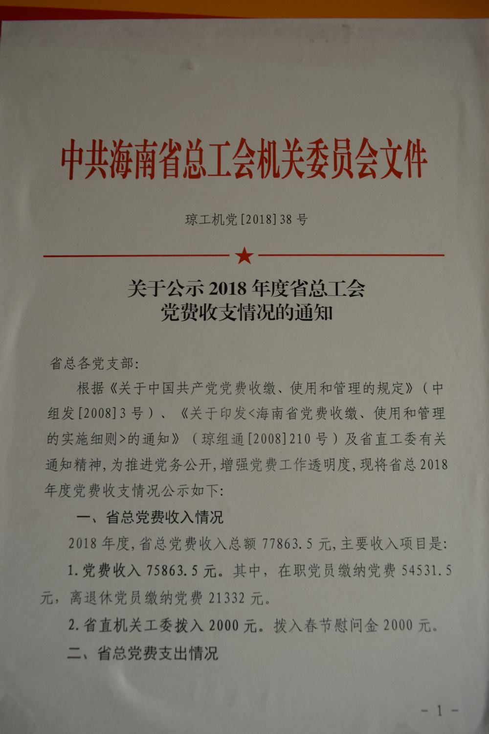 关于公示2018年度省总工会党费收支情况的通知(琼工机党〔2018〕38号)