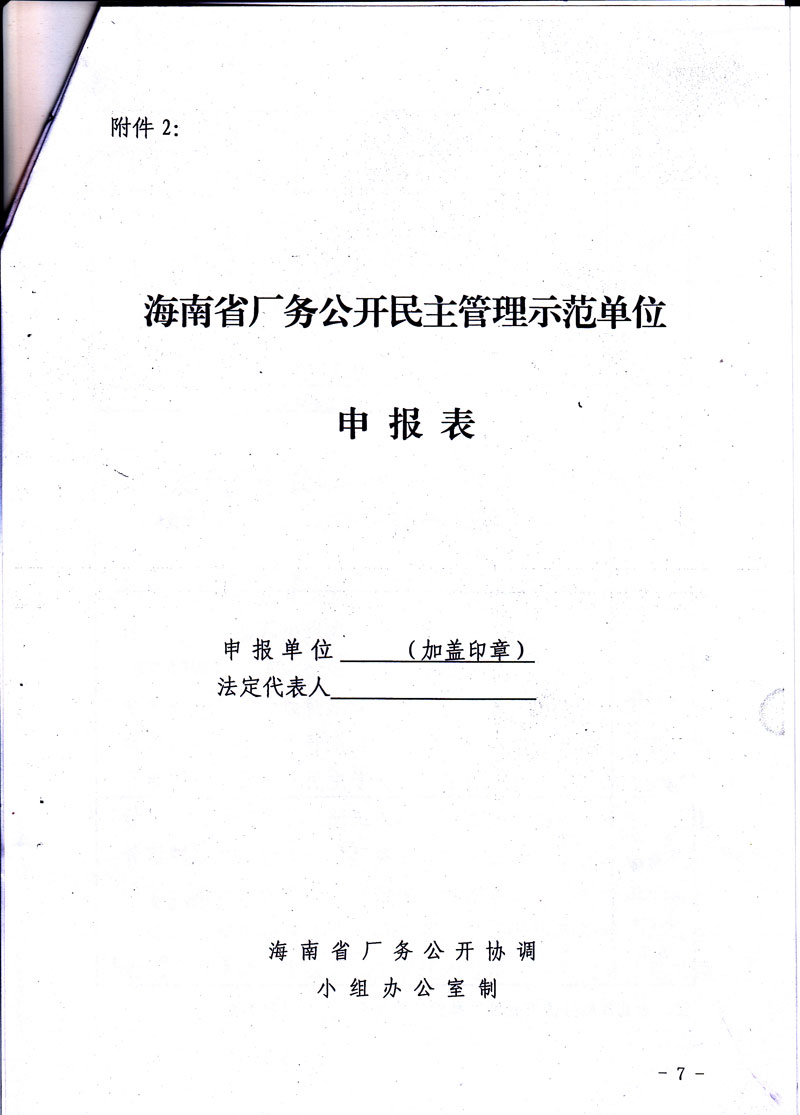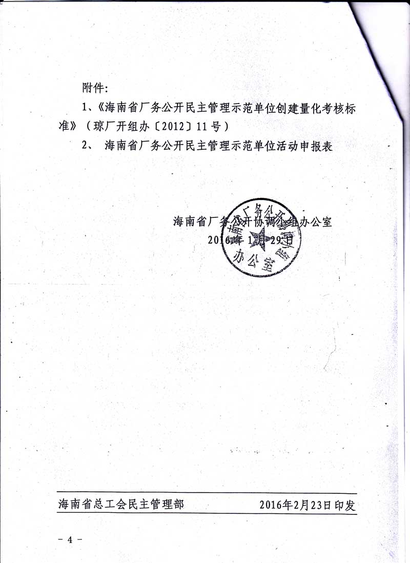 关于评选表彰海南省厂务公开民主管理示范单位的通知(琼厂开组办发〔2016〕1号)