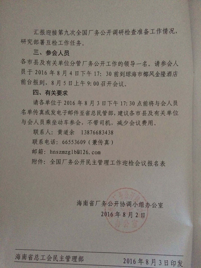 关于召开迎接第九次全国厂务公开民主管理工作调研检查准备工作汇报会的通知(琼厂开组办发〔2016〕7号)
