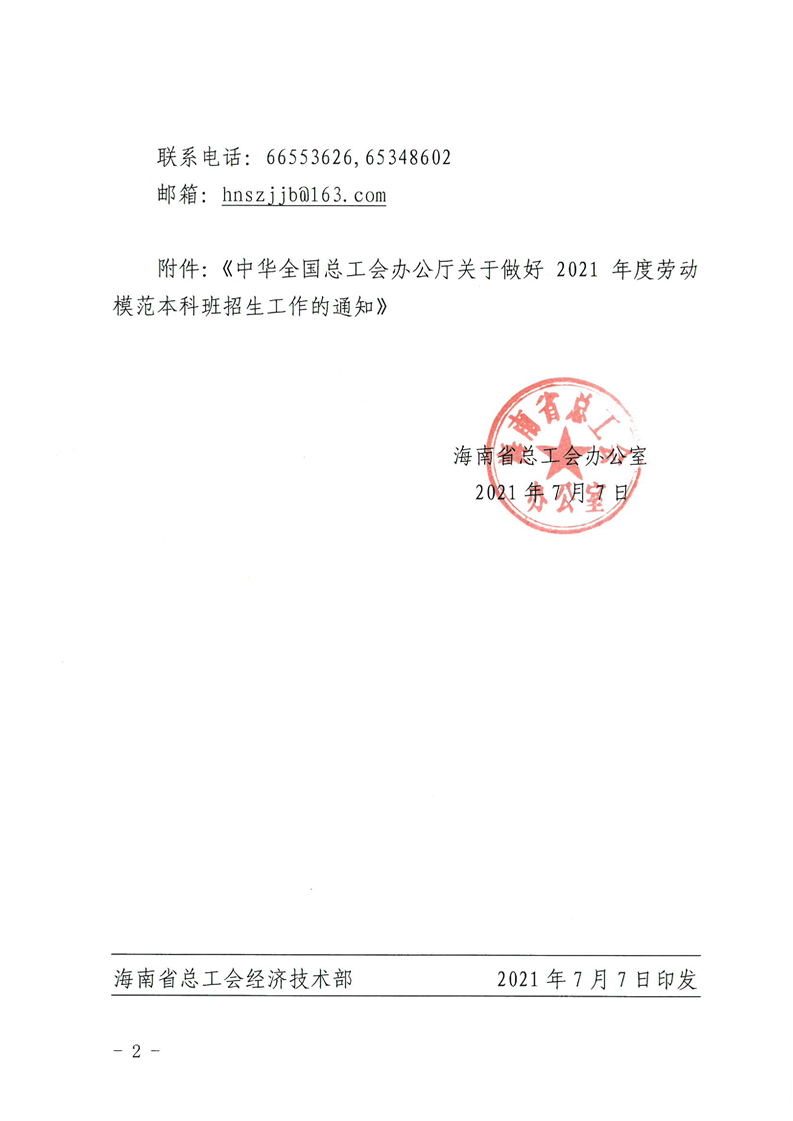 关于转发《中华全国总工会办公厅关于做好2021年度劳动模范本科班招生工作的通知》(琼工办发〔2021〕74号)