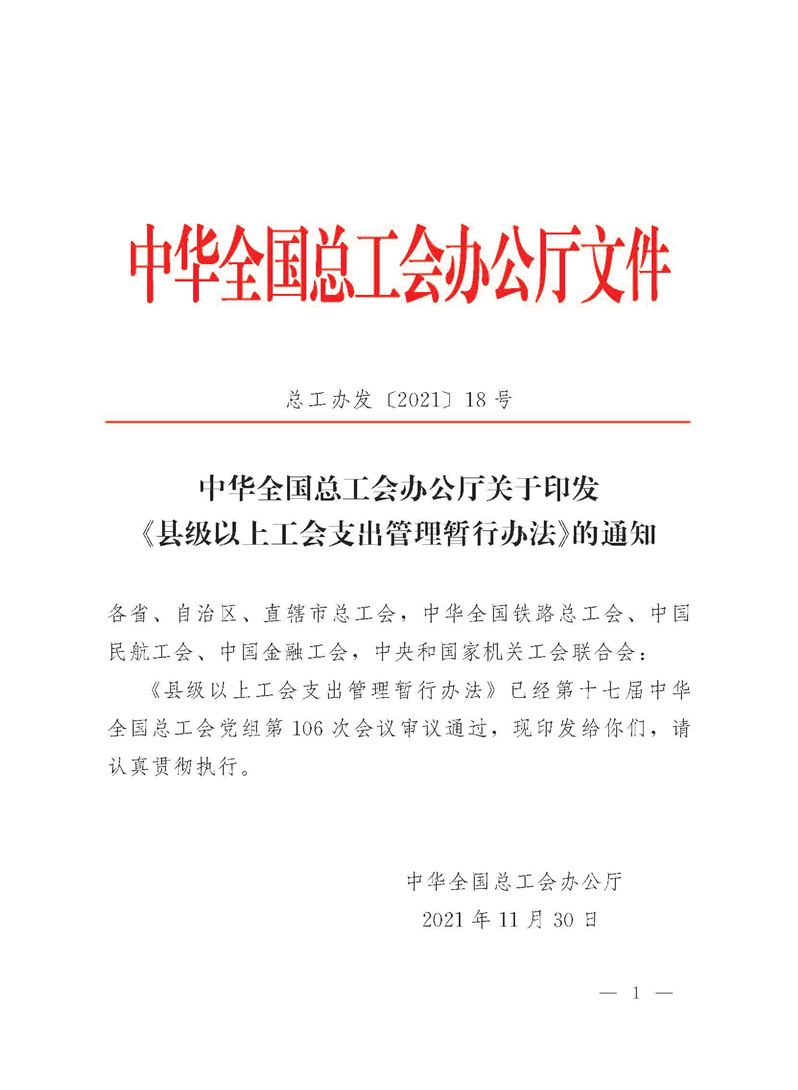 中华全国总工会办公厅关于印发 《县级以上工会支出管理暂行办法》的通知(总工办发 〔2021〕18号)