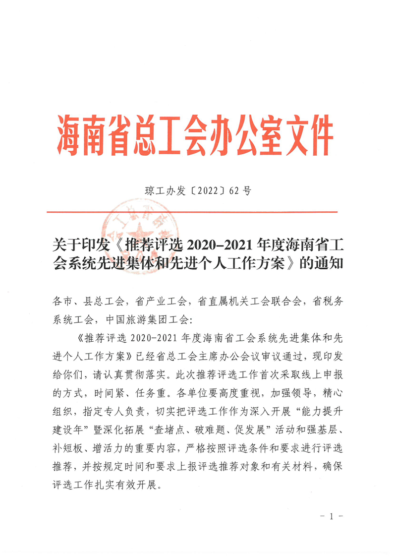 关于印发《推荐评选2020-2021年度海南省工会系统先进集体和先进个人工作方案》的通知(琼工办发〔2022〕62号)