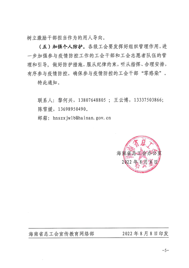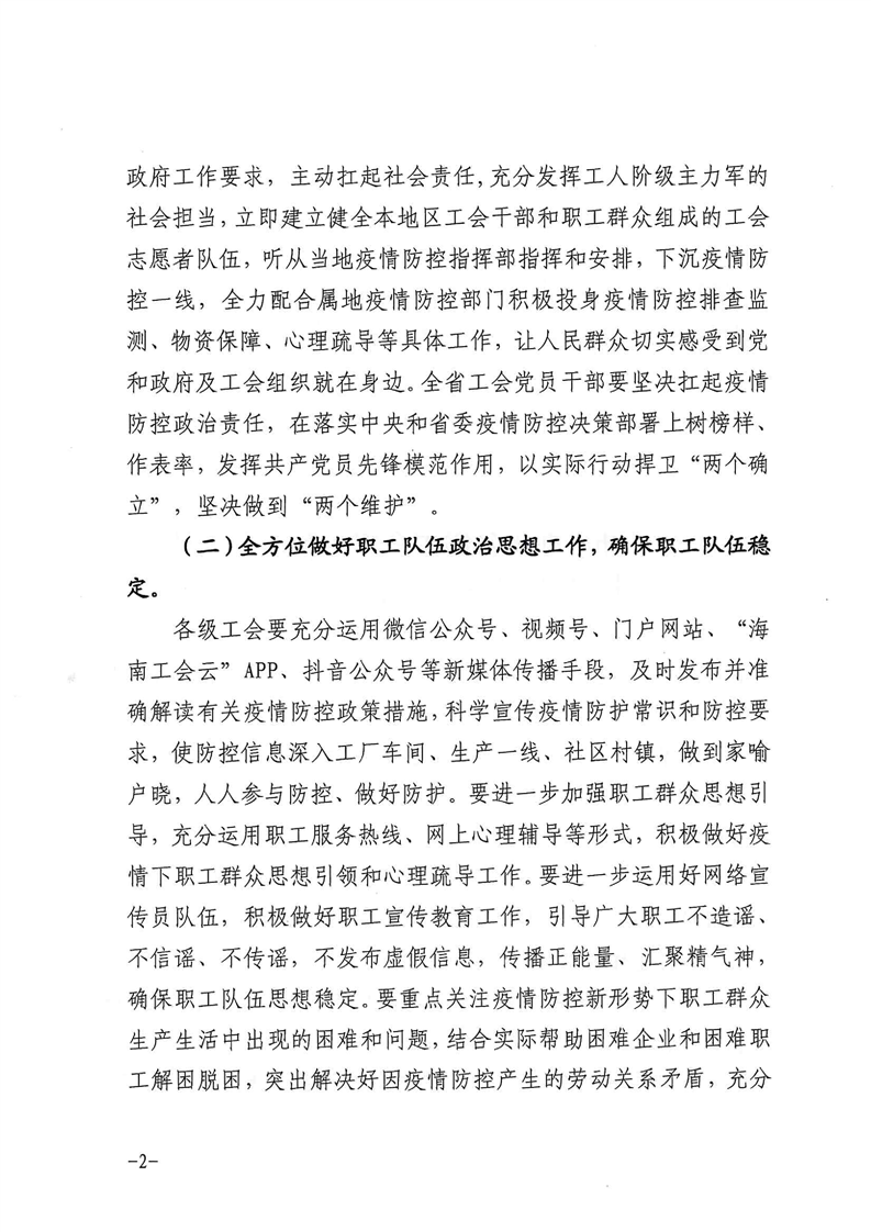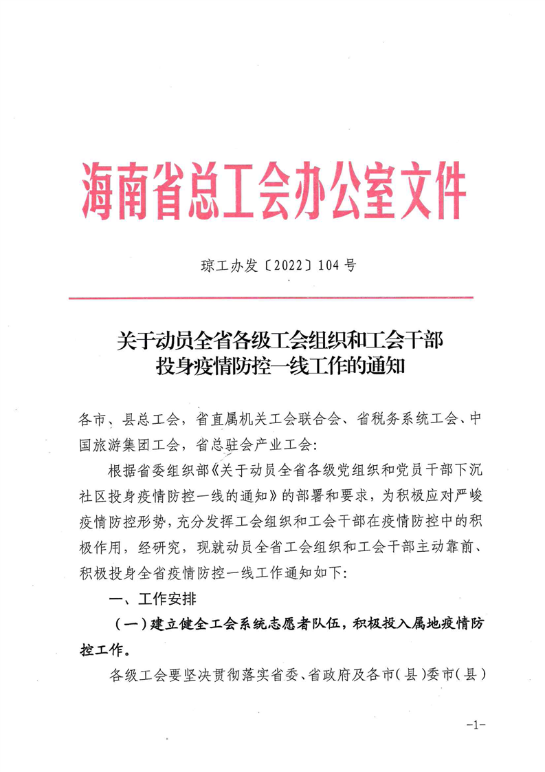 关于动员全省各级工会组织和工会干部投身疫情防控一线工作的通知(琼工办发〔2022〕104号)
