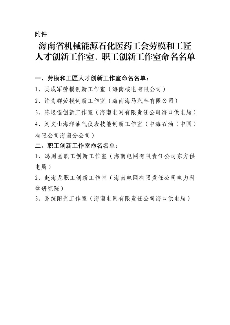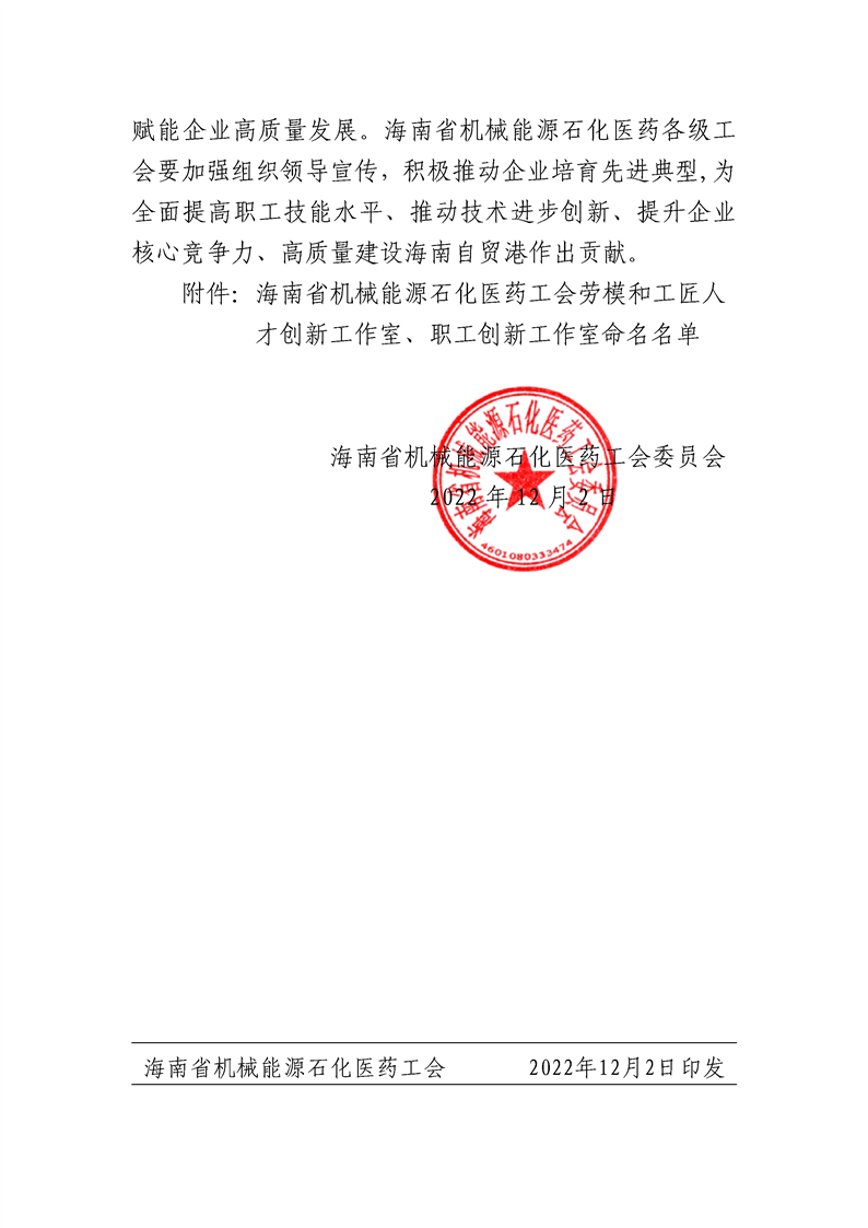 关于命名“海南省机械能源石化医药工会劳模和工匠人才创新工作室、职工创新工作室”的决定(琼机能药工字〔2022〕46 号)