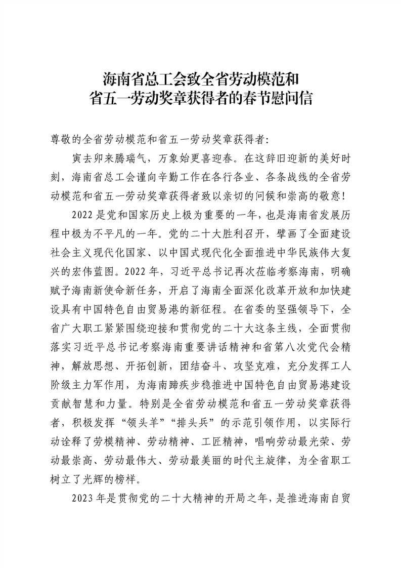 海南省总工会致全省劳动模范和省五一劳动奖章获得者的春节慰问信