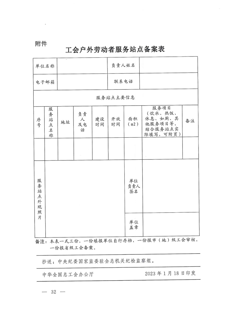中华全国总工会办公厅关于印发《工会户外劳动者服务站点建设管理运维工作指引》的通知(总工办发〔2023〕2号)
